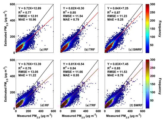Figure 4 shows the sample- and station-based CV results of the PM2.5 estimates using our SWRF model in China. In addition, the performances of the original RF model and TRF model were also evaluated in this paper. The RF model shows the worst accuracy (predictive ability) with the lowest sample-(station-)based cross-validation correlation coefficient (CV-R2) of 0.77 (0.76), the largest RMSE of 12.91 (13.05) μg m−3, and the largest MAE of 10.96 (11.22) μg m−3; however, upon considering the temporal information of the PM2.5 concentration, the model performance was obviously improved with an increased CV-R2 of 0.12 (0.12), a decreased RMSE of 1.37 (1.39) μg m−3, and a decreased MAE of 2.17 (2.27) μg m−3. By contrast, the proposed SWRF model showed the best accuracy with the highest sample-based CV-R2 (0.87) and lowest estimation uncertainties (i.e., RMSE = 11.23 μg m−3, MAE = 8.25 μg m−3). Additionally, our model had the strongest ability of PM2.5 prediction across China (i.e., CV-R2 = 0.85, RMSE = 11.53 μg m−3, MAE = 8.78 μg m−3). Furthermore, most of the data samples were close to the 1:1 line (with the strongest regressed slopes > 0.83 and the smallest intercepts < 7.5 μg m−3), especially for the highest distribution density with PM2.5 concentrations below 150 μg m−3. In general, the out-of-station results were slightly worse than the out-of-sample results, further illustrating the robustness of our model, which was mainly due to the advantages of integrated learning.
