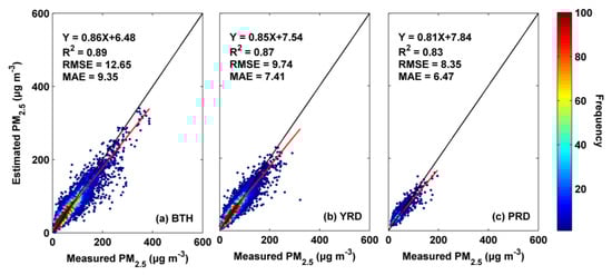Density scatter plots of the sample-based 10-CV results in the (a) Beijing–Tianjin–Hebei (BTH) region (N = 12,891), (b) Yangtze River Delta (YRD) (N = 17,407) and (c) Pearl River Delta (PRD) (N = 1984) in 2018.
