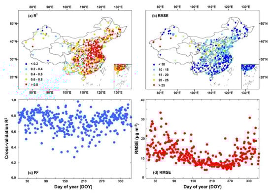 Furthermore, the temporal performance of the SWRF model as a function of the DOY was also investigated. In 2018, the CV-R2 varies from 0.27 to 0.98 with an average of 0.73 in China. In general, approximately 65.5% of all days have a high CV-R2 >0.7, with only 8 days yielding a low CV-R2 <0.4. The PM2.5 predicts are always less correlated with the ground measurements (CV-R2 = 0.67) but with lower uncertainties (RMSE = 8.32 μg m−3) on summer days than on days in the other seasons; by contrast, higher CV-R2 values > 0.72 but larger RMSEs >15 μg m−3 are always observed on spring and winter days. This disparity occurs because in summer, the dominant natural (e.g., meteorological) conditions complicate the AOD-PM2.5 relationship; by contrast, spring and winter are characterized by a higher number of severely polluted days due to intense human activity (e.g., heating) and a higher frequency of sand-dust storm days, especially in North China [44,45]. Nevertheless, 65.5% and 77.2% of the days in 2018 are observed to have high CV-R2 values >0.7 and low RMSEs <15 μg m−3 in China, indicating that the proposed SWRF model can effectively capture the time series variations of PM2.5 pollution in China.