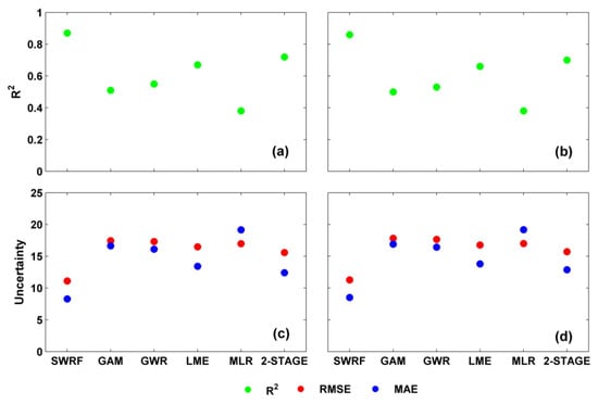Comparison of the out-of-sample and out-of-station validation results in terms of (a,b) accuracy (CV-R2) and (c,d) uncertainty (RMSE and MAE) between our SWRF model and other traditional statistical models in 2018 in China.