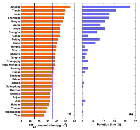 Annual mean PM2.5 concentration (a) and proportion of exposure time (b) in each province across mainland China in 2018. The black and blue vertical lines represent annual mean PM2.5 values of 15 and 35 μg m−3, respectively.