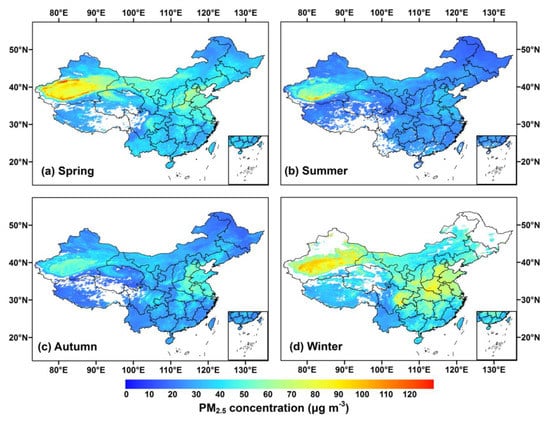 Figure 11 shows the spatial distributions of the seasonal PM2.5 in 2018 across China. Winter shows the most severe air pollution with the highest mean concentration of 50.43 ± 16.81 μg m−3; approximately 80.76% of China exceeded the acceptable air quality standard in the winter of 2018. The Xinjiang Uygur Autonomous Region, Sichuan Basin, and North China Plain are the major highly polluted areas. Fossil fuel combustion during the heating season and the unfavorable weather conditions for the dissipation of PM can explain this. By contrast, summer has the least PM2.5 pollution, and except for the desert areas of Northwest China, over 88% of the country has low PM2.5 concentrations (below 35 μg m−3). The pollution level in autumn is similar to that in summer with an average value of 30.77 ± 9.55 μg m−3. In spring, higher PM2.5 > 80 are observed, mainly in the Taklimakan Desert due to frequent sandstorms.