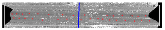 We used statistical analysis of samples to assess the intensity values in homogeneous areas before and after correction. Samples from homogeneous road surfaces in flight strips 1 and 2 were collected. The sample data of different scan ranges and scan angles from nadir to edges cover the entire sample area. Since the roads are flat, the incidence angle is nearly equal to the scan angle. A total of 30 samples from small rectangular areas with different scan ranges and scan angles were selected from the road surfaces. Each small rectangular area included 25–40 points. The standard deviation of the scan ranges for these points is less than 0.4 m, and the standard deviation of the scan angles for these points is less than 3°, similar to the study by Oh [46]. Figure 4 and Figure 5 show the sampling areas in flight strips 1 and 2, respectively, where the red boxes represent the rectangular sample areas and the blue line represents the flight path.