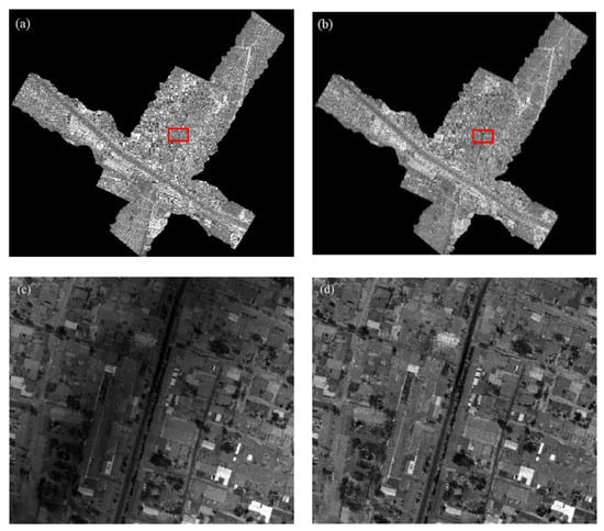 (a) The original intensity data (the reflectance); (b) the corrected intensity data by eliminating the effects of incident angle; (c) details of the red box in (a); (d) details of the red box in (b).