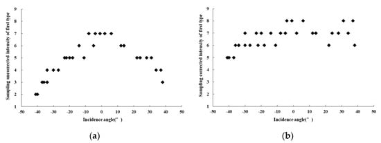 In order to further evaluate the results of intensity correction, we compared the intensity statistics of the road before and after correction. In flight strip 1, the median values of the intensity of the first type for each sample were shown in Figure 8a,b. The intensity values before correction were between 2 and 8 while the intensity values after correction were from 5 to 8, which indicated that the intensity values of the first type after correction were more concentrated. The median values of intensity of the second type for each sample were shown in Figure 9a,b. The intensity values of the second type before correction were between 1200 and 2600, while the intensity values after correction were between 1500 and 2600. The results show that the intensity values of the second type after correction were more concentrated, so were the corrected intensity values of the first type . Based on the results in Table 2, the CV of the intensity of the first type before correction was 0.36, the CV of the intensity of the first type after correction was 0.14, and the ratio of variation coefficient after correction to that before correction was 0.39 (less than 1), indicating that the theoretical model using the proposed correction method was effective. The CV of the intensity of the second type before correction was 0.20; the CV of the intensity of the second type after correction was 0.14, the ratio of variation coefficient after correction to that before correction was 0.7, which also showed that the theoretical correction using the proposed incidence angle was effective. Moreover, it was found that the CV of the intensity values of the second type was less than that of the first type , the relative reflectance before correction is more useful than the calibrated amplitude provided by the RIEGL system.