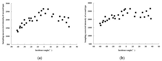 As can be seen from the above results, the intensity of the two types before and after correction were compared and assessed. The corrected intensity data have been proven to be effective by sample statistical analysis and classification accuracy assessment. The CV and ratio of coefficient variation of the two corrected intensity are smaller. This finding is consistent with Höfle and Pfeifer [25], where the variation coefficient of the intensity value by using the theoretical model in the homogeneous region is lower than that before correction. As shown in Figure 7, Figure 8, Figure 9 and Figure 10, when the incident angle is greater than 15 degrees, the influence of the incident angle on the intensity value is significantly enhanced. Kukko et al. [48] found that the effect of incident angle on the intensity was obvious, which is the consistent with this study.