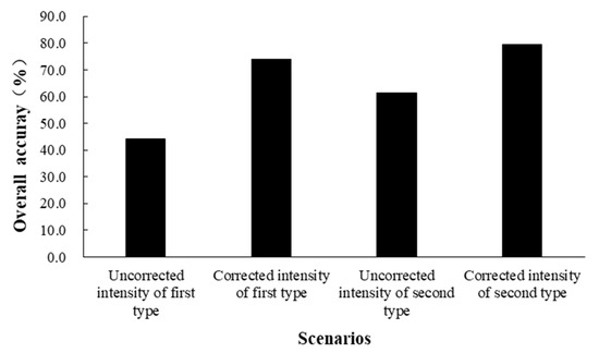From overall classification accuracies shown in Figure 12, the overall accuracy based on the intensity of the first type before correction and after correction was 44.10% and 74.11%, respectively. The overall accuracy based on the intensity of the second type before correction and after correction was 61.38% and 79.59%. After correction by the improved theoretical model, the overall classification accuracy based on the intensity of first type () was significantly improved by 30.01%, the overall classification accuracy based on the intensity of second type () increased by 18.21%. The overall classification accuracy based on the intensity of two types after correction was higher than that obtained before correction. The overall classification accuracy based on the uncorrected intensity of the first type was less than that the uncorrected intensity of the second type . For both uncorrected and corrected intensity data, the intensity of the second type ( and) was more valuable than the intensity of first type () for land cover classification.