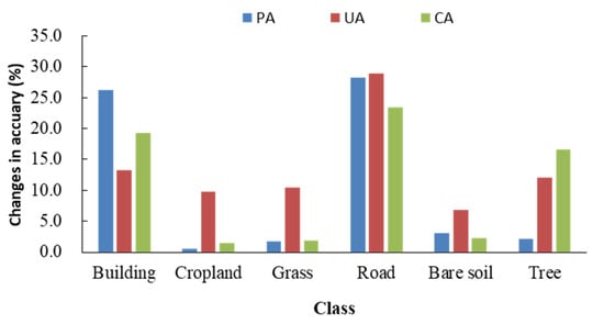 Figure 14 illustrated net changes in the classification accuracies of single class based on the corrected intensity of the first type vs. the uncorrected intensity of the first type . Net increases in PA and UA were observed for all classes. The classification accuracy for bare soil and grass improved more 40%, the bare soil and grass were barely identified based on the uncorrected intensity of the first type. The net increase in PA and UA of cropland and road was more than 30%. The building and tree showed minor changes in PA and UA, they produced more than 60% in PA. All classes resulted in net gains in CA, especially the bare soil produced the highest net gains (50.39%). The classification accuracy of the intensity after correction was significantly improved compared with the uncorrected intensity of the first type , especially in distinguishing the bare soil and grass. The correction can help improve the classification of some land cover features. Before correction, it was explained that overlap between intensity values of grass and soil and intensity values of soil and cropland. After correction, the intensity values of these land cover features showed some degree of separability.