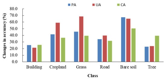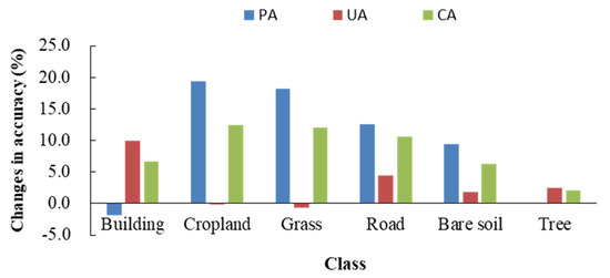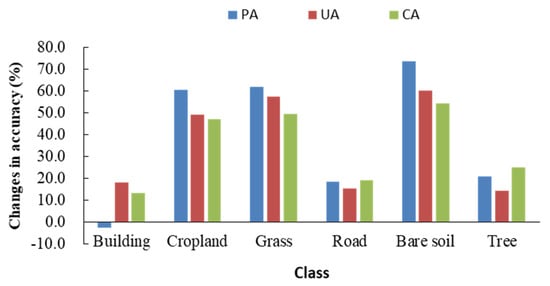 Figure 15 showed the net changes in the classification accuracies of single class based on the corrected intensity of the second type vs. the uncorrected intensity of the second type . While PA decreased 2.59% for building, there are net increases in PA and UA for all classes. Bare soil and grass showed the highest net increase (73.44% and 60.16%, 61.91% and 57.45%) in PA and UA. The classification results of bare soil and grass were poor based on the intensity of the second type before correction , which was in line with the conclusion based on the intensity of the first type before correction . All classes resulted in net gains in CA, especially the bare soil and grass produced the highest net gains (54.38% and 49.54%), this is in line with the results from the intensity of first type after correction vs. before correction . It also indicates that the identification of bare soil and grass can be effectively improved based on the corrected intensity. The net increase in the classification accuracy of cropland was 47.15%, and the corrected intensity was significant in the identification of cropland. The net increase in the classification accuracy of buildings and tree classes was the lowest but greater than 10%. The separability amongst the intensity values of grass, cropland, and soil were significantly increased after correction.