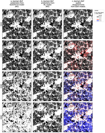 Figure 4 and Figure 5 show the historical binary urban footprint in 2015 and the predictions from the SLEUTH CA model (identified as M1) and the ML framework (identified as M2) every ten years between 2020 and 2040 for Jiaxing and Lishui, respectively. In these figures, for the first two columns we use a white color to represent urban land and a black color to represent non-urban land. For the third column, we use the white and black colors to show the corresponding urban and non-urban agreements, respectively. To highlight the spatial disagreements between the urban growth predictions for a given year in the third column, we use red and blue colors. The red color is used when the SLEUTH CA model predicts non-urban land but the ML model predicts urban land, and the blue color is used when the SLEUTH CA model predicts urban land but the ML model predicts non-urban land instead.