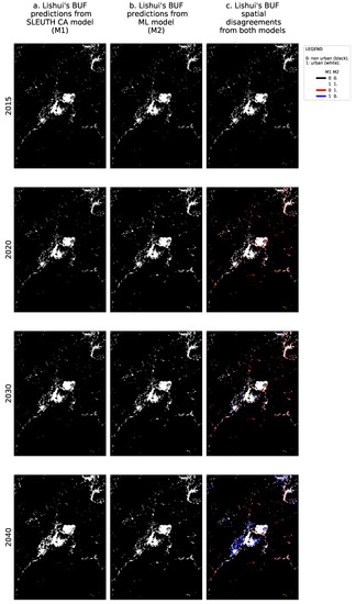 - The cumulative spatial agreement and disagreement of predicted urban areas from 2016 to 2040 removing the common urban areas that already existed in 2015 to ease the visual inspection.