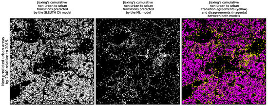 Visual inspection of Figure 2 and Figure 3, as well as Figure 4 and Figure 5, reveals that there are significant variations between the simulation results of the two models. In the long term, the SLEUTH CA model predicts larger urban areas than the ML framework in both cities. However, the ML framework predicts most of the new urbanization in the next decade or so, whereas the SLEUTH CA model predicts most of its growth till the last decades of analysis. The urbanization predictions by each model in both cities are slightly different. In Jiaxing, the SLEUTH CA model predicts a more compact growth, while the ML framework predicts a more scattered growth that manages to maintain the city structure. In Lishui, both urban growth predictions are fairly fragmented, but overall, the ML model predicts most of such growth in the periphery whereas the SLEUTH CA predicts that it will happen near the urban center.