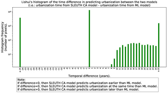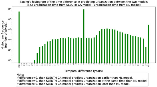 Figure 8 and Figure 9 present the histogram of the time difference (with sign) in the year in which the SLEUTH CA model and the ML framework predict the urbanization for Jiaxing and Lishui.