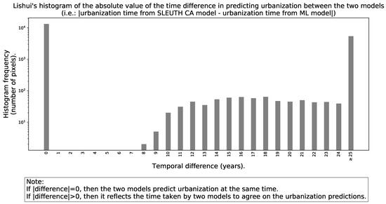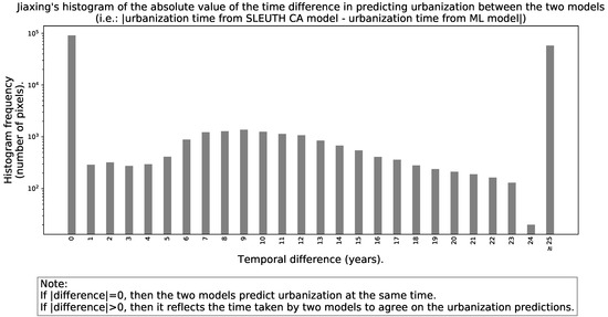 Figure 10 and Figure 11 present the histogram of the absolute value of the time difference in the year in which the SLEUTH CA model and the ML framework predict the urbanization for Jiaxing and Lishui, respectively. Therefore, in these figures, the sign of the difference disappears.