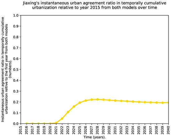 Instantaneous urban agreement ratio in temporally cumulative urbanization relative to 2015 from both models over time for Jiaxing.