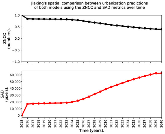 Figure 14 and Figure 15 show that both models have a better agreement in Lishui than in Jiaxing. At first glance, this conclusion seems to contradict our previous analysis, but it does not. It just reflects the fact that both the ZNCC and the SAD metrics are too influenced by the existing urban areas that were already in place for the last historical year in the data, 2015 in our case. Both metrics perform better (i.e.,: a ZNCC closer to one and a SAD value closer to zero) in larger areas of analysis experiencing little urban growth over time like Lishui than in smaller areas of analysis with fast-paced urbanization like Jiaxing. With these considerations in mind, we think that the agreement index S, modeled through Equations (2) and (3), is a stronger metric than the ZNCC for assessing the similarity of the predictions between two urban growth models.