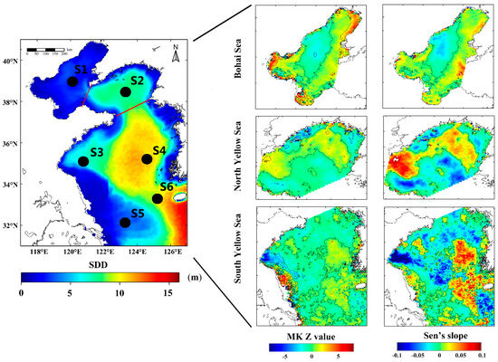 Spatial distribution of the climatological annual mean of Secchi disk depth (SDD) data derived from MODIS for 2003–2019 (left panel), and variation trend of each sea area using the Mann–Kendall (MK) test (middle panel) and Sen’s slope (right panel). Six pseudostations (S1–S6) for detailed analysis are also labeled. S1 (39.23°N, 120.27°E) and S2 (38.65°N, 123.23°E) are located in the BHS and NYS respectively. S3 (35.06°N, 120.77°E), S4 (35.06°N, 124.77°E), S5 (31.98°N, 122.98°E), and S6 (33.27°N, 125.23°E) are situated in the SYS. Each station covers the spatial extent of the 3 × 3 window on the center pixel of its latitude and longitude.