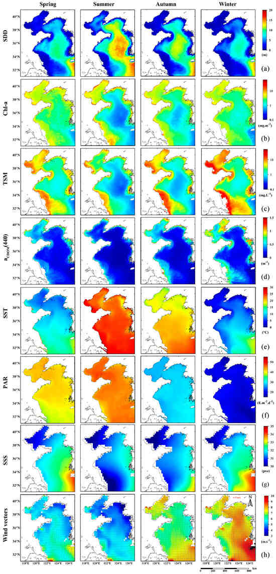 Climatological seasonal patterns of SDD (a) and related marine environmental factors, which include Chl-a concentrations (b), TSM concentrations (c), aCDOM(440) (d), SST (e), PAR (f), SSS (g), and wind vectors (h). (Spring: March to May; Summer: June to August; Autumn: September to November; and Winter: December to February).