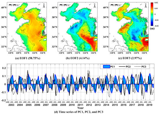The principal modes obtained by the EOF decomposition can be used to achieve the dominant space and temporal patterns and main impact factors from the time series satellite images [61,62,63]. A strong environmental factor can appear in several principal modes, and there many environmental factors can take effect in one mode. Figure 5 shows spatial patterns (a–c) and temporal amplitudes (d) for the first three SDD EOF modes.