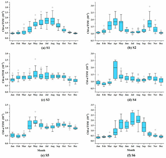Monthly variations of Chl-a/TSM ratios from the six stations (a–f). Each boxplot chart includes the minimum, maximum, median, first quartile, third quartile, and outliers.