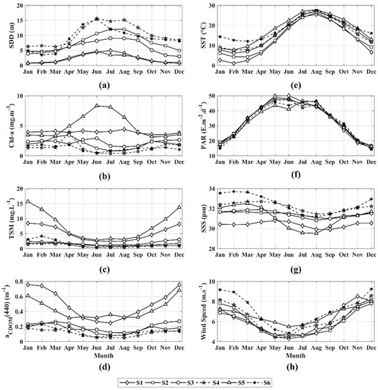 Monthly mean variations of SDD (a) and marine environmental factors from six stations, which include Chl-a concentrations (b), TSM concentrations (c), aCDOM(440) (d), SST (e), PAR (f), SSS (g), and wind speed (h).
