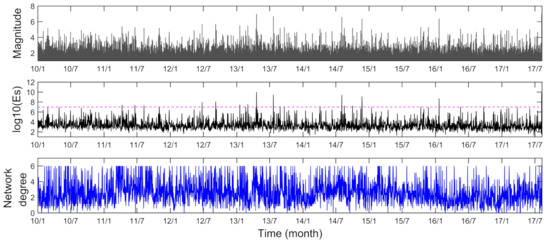 From top to bottom are variations of the seismicity, the parameter and daily network degree during 2010-2017, respectively. The pink horizontal line indicates = .