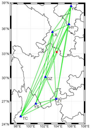 An example of the strain network result for a fully connected network on 8 August 2017, Ms7.0 Jiuzhaogou earthquake. The green lines represent the connections between two stations. The red star shows the epicenter of the earthquake.