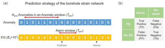 (a) Schematic diagram of the prediction strategy of the borehole strain network. We assume that a target earthquake with will occur in an alarm window, , if . (b) Confusion matrix of the prediction results.