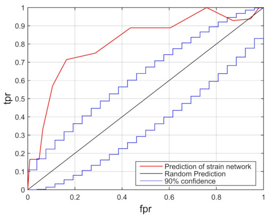 As a result, the diagonal line in the ROC diagram indicates a prediction by random guessing [24,53,54], and the confidence interval of the true positive rate at each alarm rate can be computed. Any prediction above the diagonal line shows that the number of predicted earthquakes is better than that of false alarm days. Next, the Area Under the Curve (AUC) is introduced to evaluate the efficiency of the prediction. The expected area of random prediction is 0.5, where an area greater than 0.5 indicates that the strain network anomalies may contain precursory earthquake information. The result in Figure 5 shows that the prediction for and days is obviously better than random guess with AUC = 0.81.