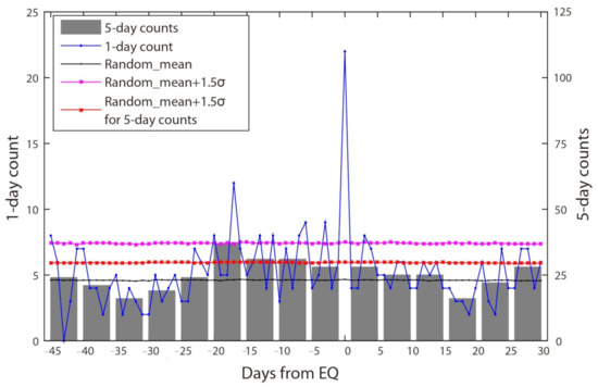 To reduce the contingency of ROC detection, we performed statistical studies based on Superposed Epoch Analysis (SEA) of the strain network during 2010–2017 preferentially. SEA is a statistical method to highlight typical features of a special event by reducing random noise by superposition [55,56,57]. First, if there is a network anomaly, we count one for that corresponding day for the whole dataset. Here, we set the threshold of the network degree to 4. Then, for each target earthquake, we extracted a data set of 45 days before and 30 days after its occurrence day. We repeated this procedure for the 26 target earthquakes, and then superposed the counts for all data sets. We performed the SEA results of 1-day count and 5-day counts as shown in Figure 6, respectively. To evaluate statistical significance, we randomly selected 26 days instead of studied earthquakes in the whole dataset, and conducted the same procedure. We repeated such random SEA tests 10,000 times to calculate the random_mean and the random standard deviation () [54,57].