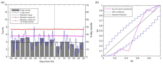 Moreover, we performed a comparative analysis with shuffled target earthquakes [58]. The SEA analysis and the ROC detection results are shown in Figure 7. The counts of network anomalies corresponding to the shuffled target earthquakes are random and not significant. And the ROC result indicates that the network anomalies do not contain precursory information, with AUC being 0.42. Therefore, the above results further suggest a possible relationship between the network anomalies and earthquakes ().