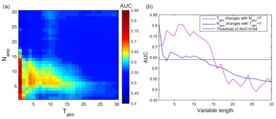 (a) AUC for the condition of for different numbers in an anomaly window and different lengths of the alarm window. (b) Two typical AUC changes. The pink line indicates AUC changes with when , whereas the blue line indicates AUC changes with when . The horizontal line is the threshold, which is the AUC of the upper boundary of the 90% confidence interval for random prediction. The AUC of the upper boundary curve is 0.64.