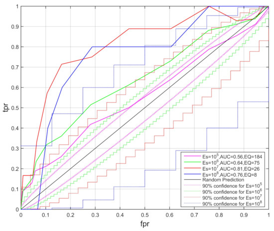 The crustal deformation before earthquakes is an important factor in integrated seismological research. To examine whether borehole strain measurements are useful crustal information before earthquakes, statistical tests were performed for the aligned GNSS-azimuths related to earthquakes with magnitudes greater than 5 during 2012–2015 in similar areas [24,62]. The ROC diagram of the optimal prediction strategy shows the prediction is obviously better than the random prediction, indicating the correlation between aligned GNSS-azimuths and earthquakes. Precursor patterns recorded several days before major earthquakes in the seismicity have also been found through the measurement of other remote sensing data, which may be helpful for earthquake prediction [63,64,65]. Sarlis et al. [64] used the natural time analysis to study the electric signal activity and found that changes of the order parameter appeared minima a few days before a mainshock. [64]. The statistical significance of this study has recently been verified through the ROC technique by focusing on the AUC [31] and event coincidence analysis [66].