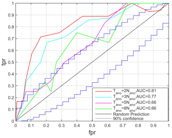 Second, we tested the influence of different proportions of anomalies in an anomaly window, as shown in Figure 10. This test also shows the ROC curves with fixed values of and . We found that, when there were more than half () or a third () of network degree anomalies in an anomaly window, the detection efficiency was more significant and stable. When there were few anomalies in an anomaly window, the detection efficiency was low and especially when , the result seems to be accidental and irregular. This result shows that clusters of anomalies indicate an increased probability of an earthquake, which is also consistent with the physical assumption [32].