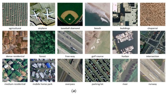 In our experiments, three well-known remote-sensing datasets are used for evaluation: Merced land-use dataset [57], Aerial image dataset (AID) [58], and the Optimal-31 [41] dataset. The characteristic of these three datasets are listed in Table 2, and samples from each dataset are shown in Figure 4.