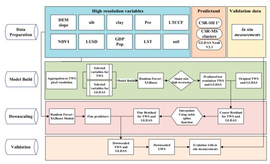 (1) Data Preparation: We prepared two targets—TWS change and GLDAS change data, validation data (in situ measurements) and 1-km high-resolution variables that either directly or indirectly influenced the targets. The fine predictors were aggregated into coarse predictors to be identical to the target variables according to the pixel size of the TWS resolution (i.e., for each predictor, the average value and mode in each pixel were used for the numerical and categorical predictors, respectively) after transferring the GRACE data from the geographic coordinate system to the projection coordinate system.