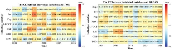 The correlation coefficient between individual variables and targets (the left for TWS and the right for GLDAS) from 2004–2016 except categorical variables.