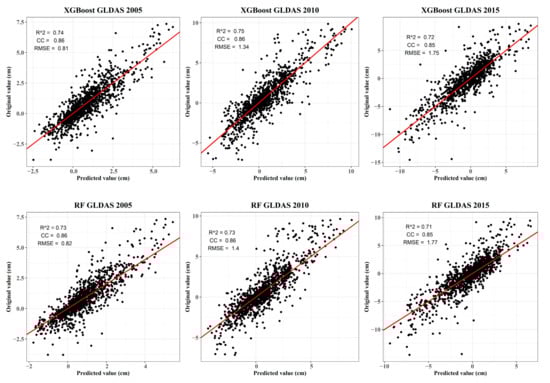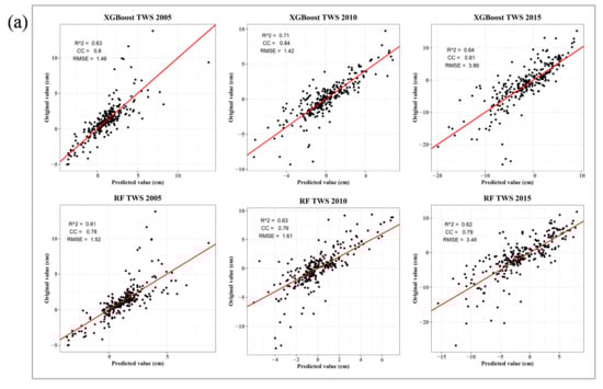 Figure 6 shows the scatterplots and regression fits of the downscaled GLDAS (i.e., the sum of SWE, SMS and CWS) data using the XGBoost and RF models and the original dataset for 2005, 2010 and 2015 (the results of other years are also given in the supplementary file, Figures S10 and S12). These plots demonstrate good agreement between the predicted and original datasets. Figure 7 shows the evaluation metrics of the XGBoost- and RF-based models for the GLDAS from 2004 to 2016. The R2 accuracy of the XGBoost model ranged from 0.64 to 0.82, the CC ranged from 0.80 to 0.91 and the RMSE ranged from 0.63 to 1.75, while the R2, CC and RMSE had ranges of 0.63–0.82, 0.80–0.90, 0.63–1.77 respectively, for the RF model. The highest R2 and CC were reached for 2008, with values of 0.82 (R2) and 0.91 (CC) for the XGBoost model and 0.82 (R2) and 0.90 (CC) for the RF model. The overall correlation was strong, but the overall dispersion degree was higher than that of the TWS. Moreover, both R2 and RMSE accuracies of XGBoost models were better than that of RF models in all years.