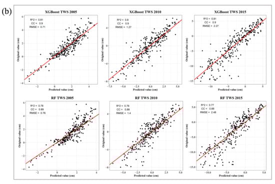 R2, CC and RMSE metrics of the RF-modeled and XGBoost-modeled TWS based on (a) CSR-MS.906 clusters and (b) CSR-SH data.