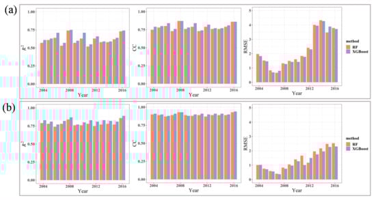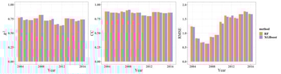 R2, CC and RMSE metrics of the RF-modeled and XGBoost-modeled GLDAS.