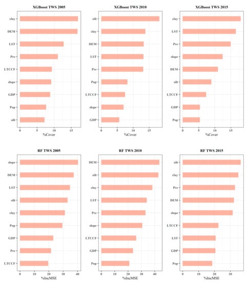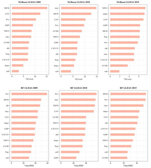 Figure 8 shows plots of the variable importance measure for the XGBoost- and RF-modeled GLDAS for 2005, 2010 and 2015 (the results of other years are also given in the supplementary file, Figures S11 and S13). Comparing the importance of variable given by XGBoost-based and RF-based model, the DEM and precipitation always ranked in the top six except that precipitation ranked seventh in 2012 based on RF. There were 10 years during which the importance of LST ranked in the top six. Other categorical variables, such as clay, also exerted significant influences (within the top six) among 8 years.
