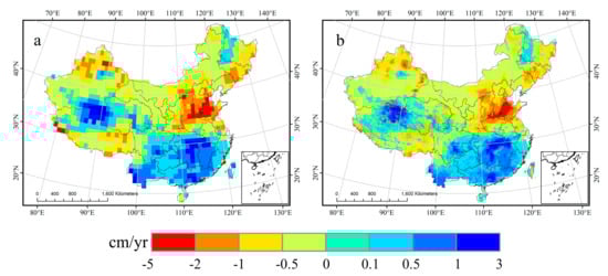 Thiel-Sen’s slope before and after downscaling the GRACE GWS for 2004–2016. (a) Slope of the original GWS; (b) Slope of the XGBoost-downscaled GWS.
