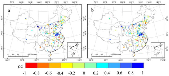 Correlation maps between the GWS and in situ measurements across China. (a) correlation map between the original GWS and in situ measurements; (b) correlation map between the XGBoost-downscaled GWS and in situ measurements.