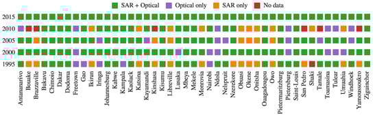 In order to cover the entire 1995–2015 period with both optical and SAR images, data were acquired from seven different sensors: Landsat 5 TM (125 products), Landsat 7 ETM+ (66), Landsat 8 (60), ERS-1&2 (127), Envisat (54) and Sentinel-1 (49), that is, 481 scenes in total. Characteristics of each sensor are detailed in Table 2. As shown in Figure 1, the coverage was far from being complete. Both optical and SAR were only available in 71% of cases. Overall, the coverage is lower as we go back in time. Thanks to the systematic global acquisition approach of today’s satellites such as Landsat 8 or Sentinel-1, coverage was complete in 2015. In the past, global acquisitions were not systematic. For instance, only 6% of the scenes in the Landsat 5 TM catalog are over Africa, against 12% for Landsat 7 ETM+ []. This left many African locations without any Landsat acquisition before 1998, and a similar issue is observed with the catalogues of ERS-1&2 or Envisat. Cloud cover above tropical areas was also a major issue. As a matter of fact, the average cloud cover of the Landsat acquisitions over Kinshasa was 76%. Across the entire catalog, only 5 scenes with a cloud cover less than 10% were available over Kinshasa, and none before 2000. The issue was partially mitigated by the use of SAR acquisitions, which are not sensitive to cloud cover or weather variations.