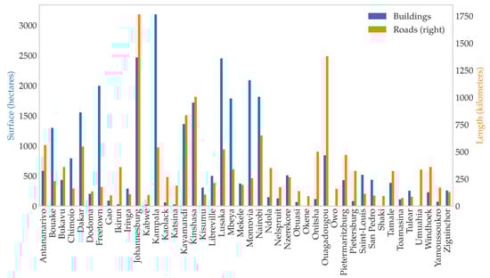 Geographic extracts of the OSM database were acquired from the Geofabrik website (http://download.geofabrik.de) in May 2019 and imported into a local PostGIS database. Four categories of OSM objects were then extracted for each case study: (1) highway polylines (the road network), (2) landuse, leisure, and natural polygons (potential non-built-up training samples), (3) building polygons (built-up training samples), and (4) natural=water polygons to allow the creation of a land mask. Once again, as shown in Figure 2, some urban areas in SSA suffer from low data availability. No buildings footprints were available in Okene, Shaki, or Owo. Likewise, only a few building footprints were available for several urban areas with more than 1 million inhabitants such as Umuahia, Katsina, Ikirun or Onitsha. On the contrary, road segments were available for all the case studies. For instance, at least 70 km of roads were extracted for small urban areas such as Toamasina, Tulear, San Pedro or Gao.