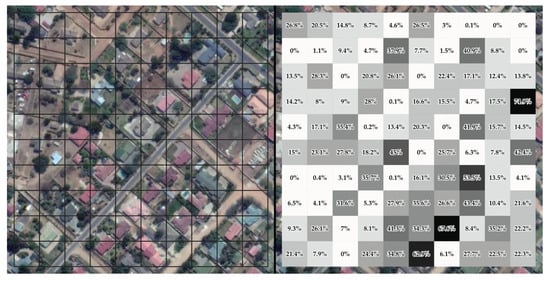 Schneider et al. [], Mertes et al. [] defined a built-up area as a location dominated by constructed surfaces—in other words, surfaces that are covered by at least 50% of constructions, including asphalted roads. However, such a definition may lead to the omission of a large amount of built-up areas. Figure 3 shows the percentage of buildings in a grid of m cells, which is the spatial resolution of a Landsat image. According to the aforementioned definition, only 4 pixels out of 100 would be classified as built-up, that is 4% of the area of interest. Such a high threshold can only imply the omission of most of the suburban and rural settlements. To overcome the issue, the GHSL defined built-up as a continuous measure corresponding to the proportion of building footprint area within the total size of a cell []. That would correspond to a built-up value equal to 18% over the area of interest. However, because of the complexity of the urban environment, quantifying the proportion of buildings in a given pixel is not a solved problem in urban remote sensing.