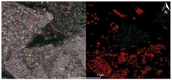 Training samples collected from OSM in Nairobi, Kenya. (a) Aerial view of the area of interest, courtesy of Goole Earth; (b) built-up (red) and non-built-up (green) training samples over the same area of interest.