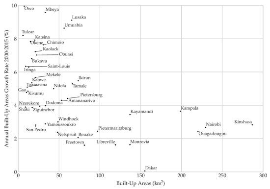 Despite the reported uncertainties, the results of the present study are consistent with the findings of the Atlas of Urban Expansion []. Urbanization is not uniform across Sub-Saharan Africa, and urbanization rates reported at the regional or national scale can have little meaning at the local scale. Across the case studies, built-up areas averaged a CAGR of 4.8% between 2000 and 2015, with high variations depending on the size of the urban area: from an average of 3.2% in large urban areas to 5.4% in the smaller ones. Despite the common assumption that built-up areas grow at higher rates than the urban population [], the average CAGRs of built-up areas were not that far from the urban population annual growth rate of 4.1% reported by the UN for the region []. This suggests that the common assumption that cities are expanding their territories faster than their populations [] is not ubiquitous in Sub-Saharan Africa. In fact, in the context of this study, population densities in built-up areas did not decrease between 2000 and 2015 in urban areas such as Dakar, Freetown, Monrovia, Johannesburg, Libreville, Ouagadougou, Kinshasa, Nairobi or Kampala. Nevertheless, this is without taking into account that the ecological footprint of an urban area can be hundreds of times larger that the extent of its built-up areas []. Likewise, the 1600 km areas of interest used in this study did not cover the whole urban areas of large cities such as Dakar, Johannesburg or Nairobi. Since most of the growth may occur in peri-urban and surrounding localities due to a lack of space, the actual growth of built-up areas may have been under-estimated in that case.
