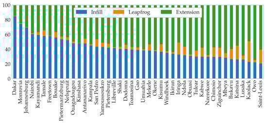 Analyzing the newly built-up areas with respect to their spatial context delivers another dimension of urban expansion. Figure 9 shows, for each case study, the share of each expansion type: infill, extension or leapfrog. Overall, infill expansion reaches an average share of 41%. However, large variations are observed across the case studies. In some large urban areas such as Dakar, Monrovia, Johannesburg or Nairobi, more than 60% of the growth actually occurs inside the existing urban extent. On the contrary, in small urban areas such as Saint-Louis, Owo, or Kaolack, infill expansion makes up for less than 20% of the total growth. Data aggregation based on the size of the urban area confirms the trend: on average, the share of infill expansion reaches 54% in large urban areas, 44% in medium-sized urban areas, and 35% in the small ones. In other words, the sprawl’s share (infill and extension) is higher in smaller urban areas. Defining sprawl as the combination of extension and leapfrog—or, in other words, as the newly built-up areas that increase the urban extent—allows the calculation of annual sprawl rates. In small and medium-sized urban areas, the average annual sprawl rate reaches respectively 4.1% and 3.4%, whereas it is only 2.1% in large urban areas.