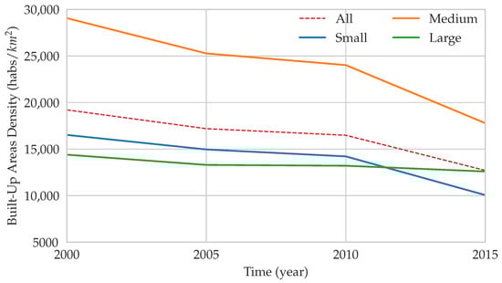 Evolution of population densities in built-up areas (people per km) between 2000 and 2015 for small (less than 500,000 people in 2000), medium (between 500,000 and 1,000,000 people), and large cities (more than 1,000,000 people).